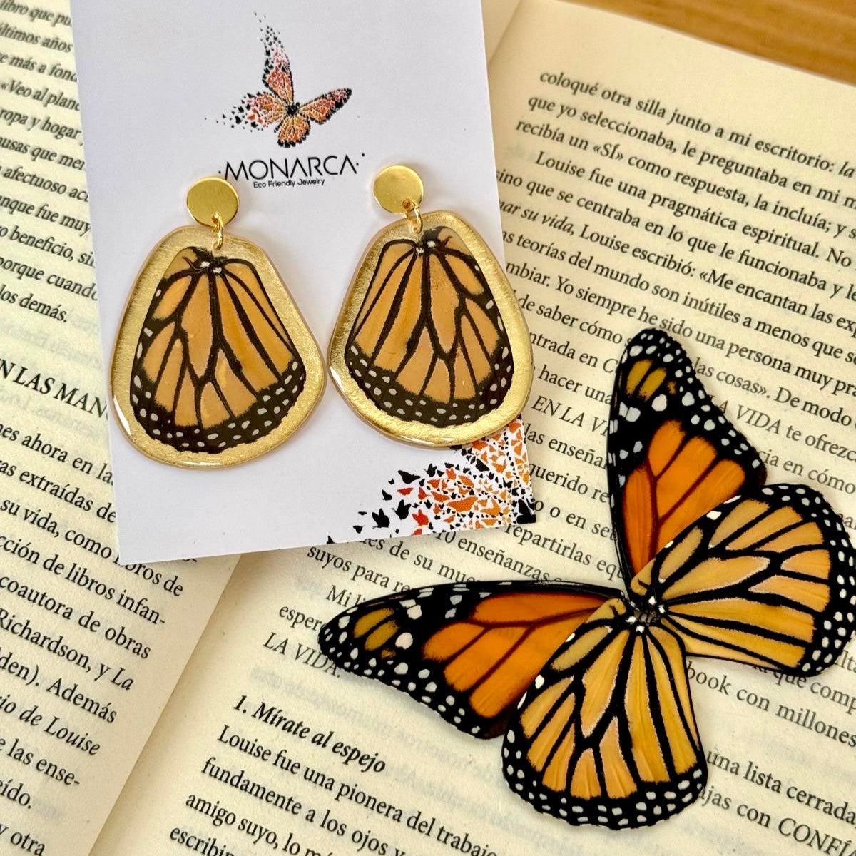 Aretes elaborados con alas inferiores de la mariposa Danaus plexippus y topo hipoalergénico en acero.
