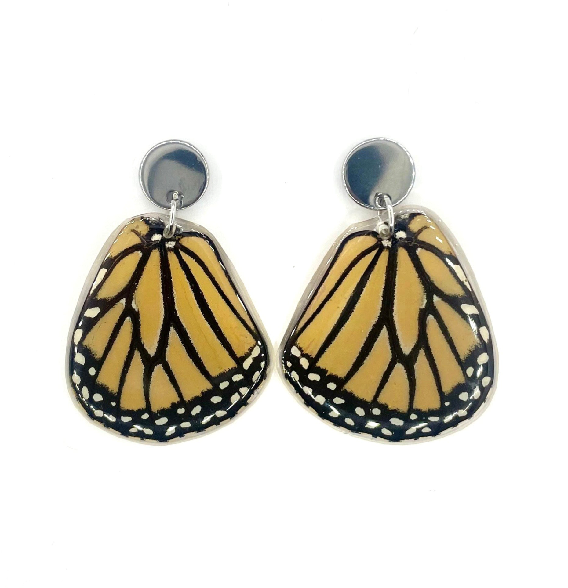 Aretes elaborados con alas inferiores de la mariposa Danaus plexippus y topo hipoalergénico en acero.